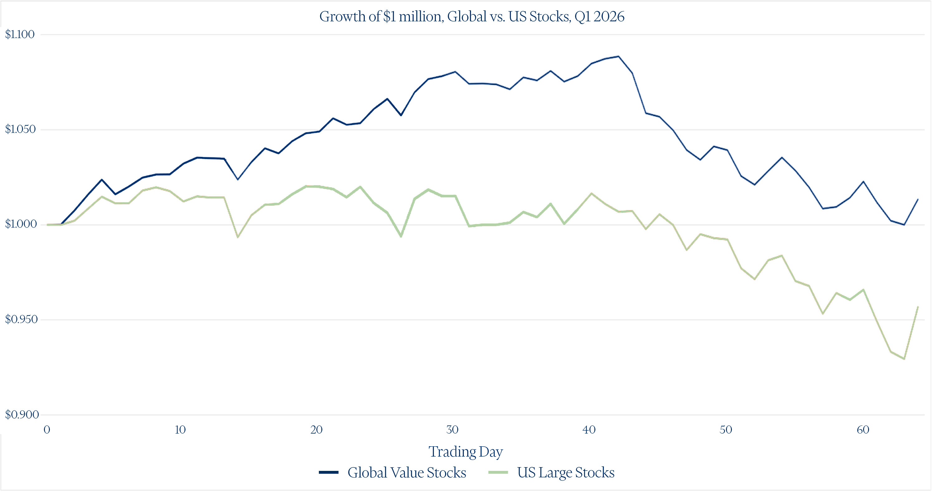 Across all major regions, relatively low-priced companies—commonly referred to as “value stocks”—outperformed broader market indices. The chart below illustrates the growth of $1 million invested at the beginning of the quarter in U.S. large-company equities versus a diversified portfolio of global value stocks (U.S. and international, across both large and small companies) over the 64 trading days of the quarter.1