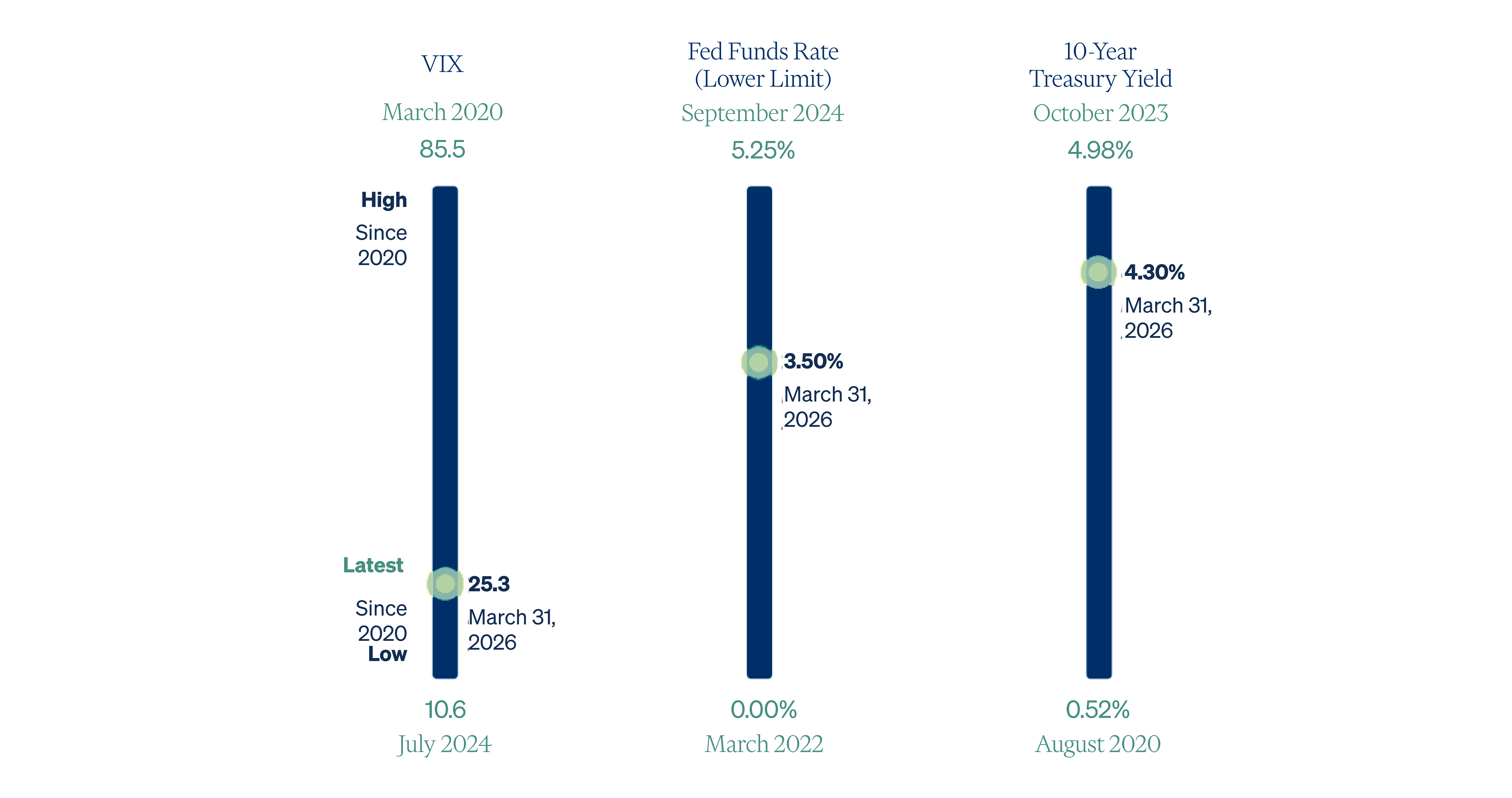The CBOE Volatility Index (VIX), a widely followed barometer of expected near-term market volatility, peaked at 35.3 during the quarter (following the outbreak of the Iran conflict) and ended at 25.3. Neither level is especially notable when viewed in historical context.