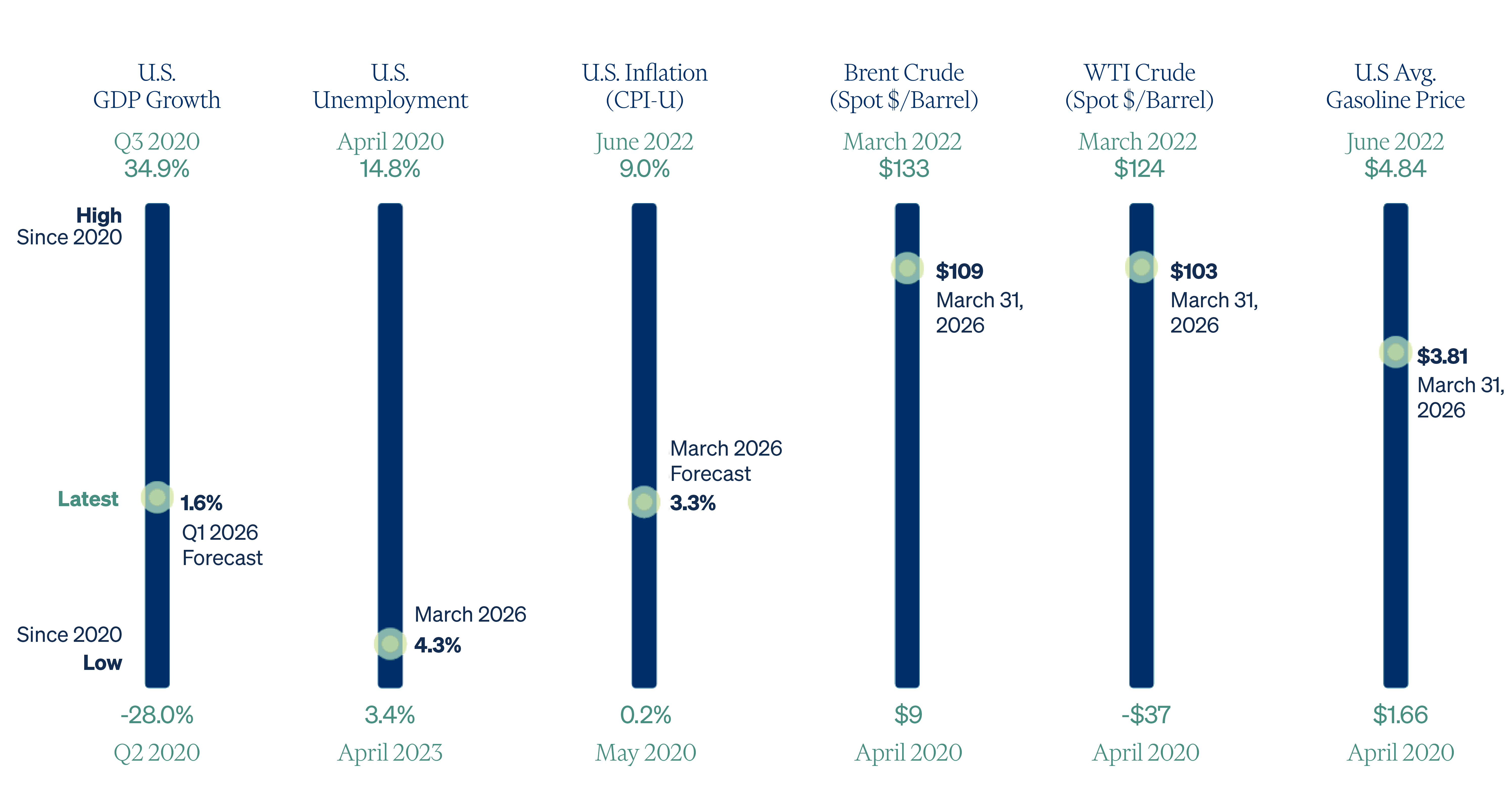 Economic and Market Indicators: High, Low, Current, January 2020 –March 2026